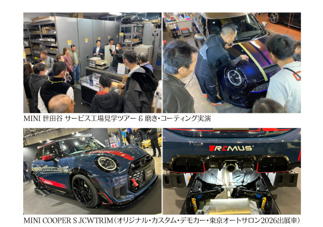 普段は立ち入ることのできないサービス工場を、スタッフの案内で巡る見学ツアー。 磨き・コーティングの実演や、整備のこだわりを間近で体感したあとは、東京オートサロン2026に出展したスポーツマインドあふれるカスタム・デモカーやMINIの最新モデルの試乗へ。MINIを支える技術と情熱を知ることで、カーライフの印象はきっと変わります。