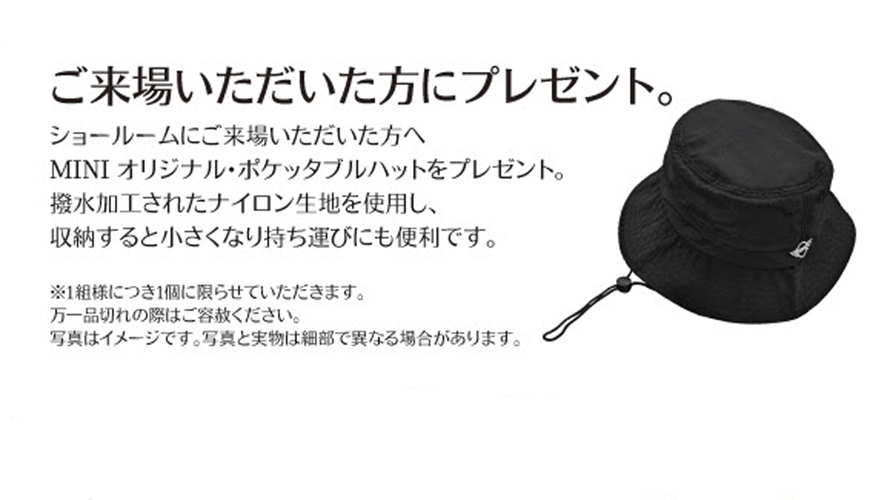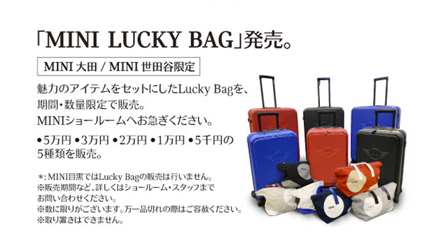 MINI新春フェア2026 - 1月10日(土)~12日(月・祝) ご来場いただいた方にプレゼント MINI オリジナル・ポケッタブル・ハットをプレゼント。 撥水加工されたナイロン生地を使用し、収納すると小さくなって持ち運びにも便利です。 ※1組様につき1個とさせていただきます。 ※万一品切れの際はご容赦ください MINI LUCKY BAG 販売 魅力のアイテムをセットにしたLucky Bagを期間、数量限定で販売します。 5万円,3万円,2万円,1万円,5千円の5種類を販売します。 MINI ショールームへお急ぎください。 ※数に限りがございます、万一品切れの際はご容赦ください。 話題のニューモデルもご覧いただけます The MINI Paul Smith Editionや話題のニューモデルがお出迎え 展示車、試乗車が皆さまのお越しをお待ちしております。 2026年の新年はMINIと共に!